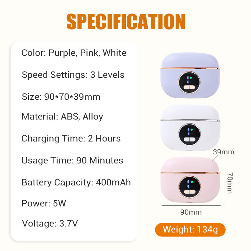 COMPACT ET RECHARGEABLE : Son design léger et portable ainsi que sa batterie haute capacité le rendent idéal pour une utilisation à la maison ou en déplacement. Profitez jusqu'à 90 minutes d'utilisation sans fil après une seule charge pour un soin des ongles pratique, où que vous soyez.