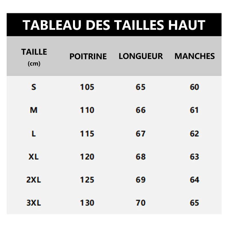 Taille : S, M, L, XL, 2XL, 3XL