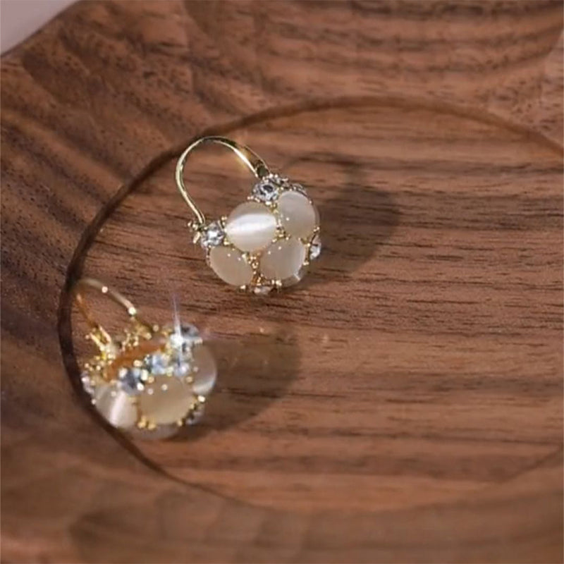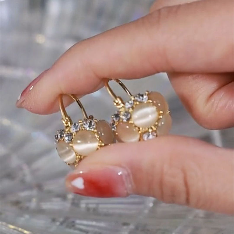 EMBELLISSEMENTS EXQUIS : Les boucles d'oreilles sont ornées d'une grappe de pierres précieuses de forme ovale et de petits cristaux étincelants. Les pierres précieuses ont une surface lisse et laiteuse avec des veines subtiles, ajoutant une touche d'élégance naturelle, tandis que les cristaux apportent une brillance éclatante.